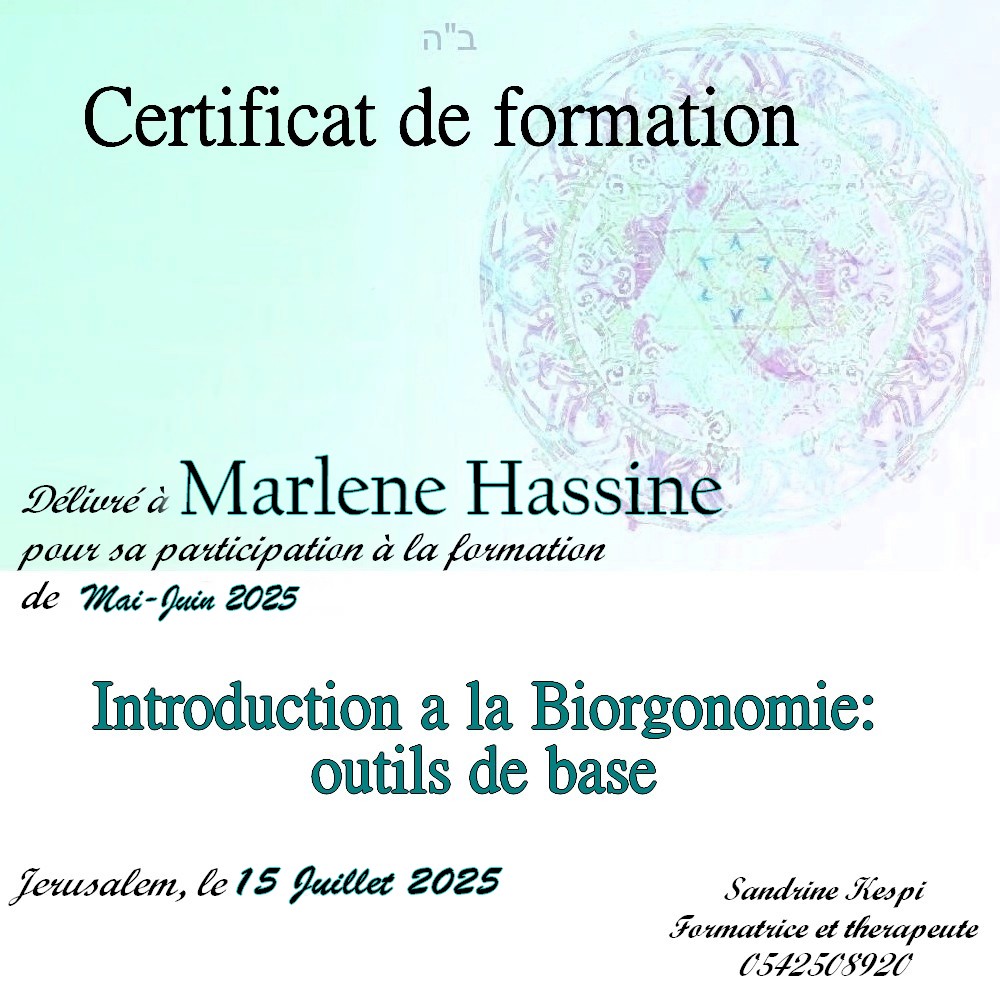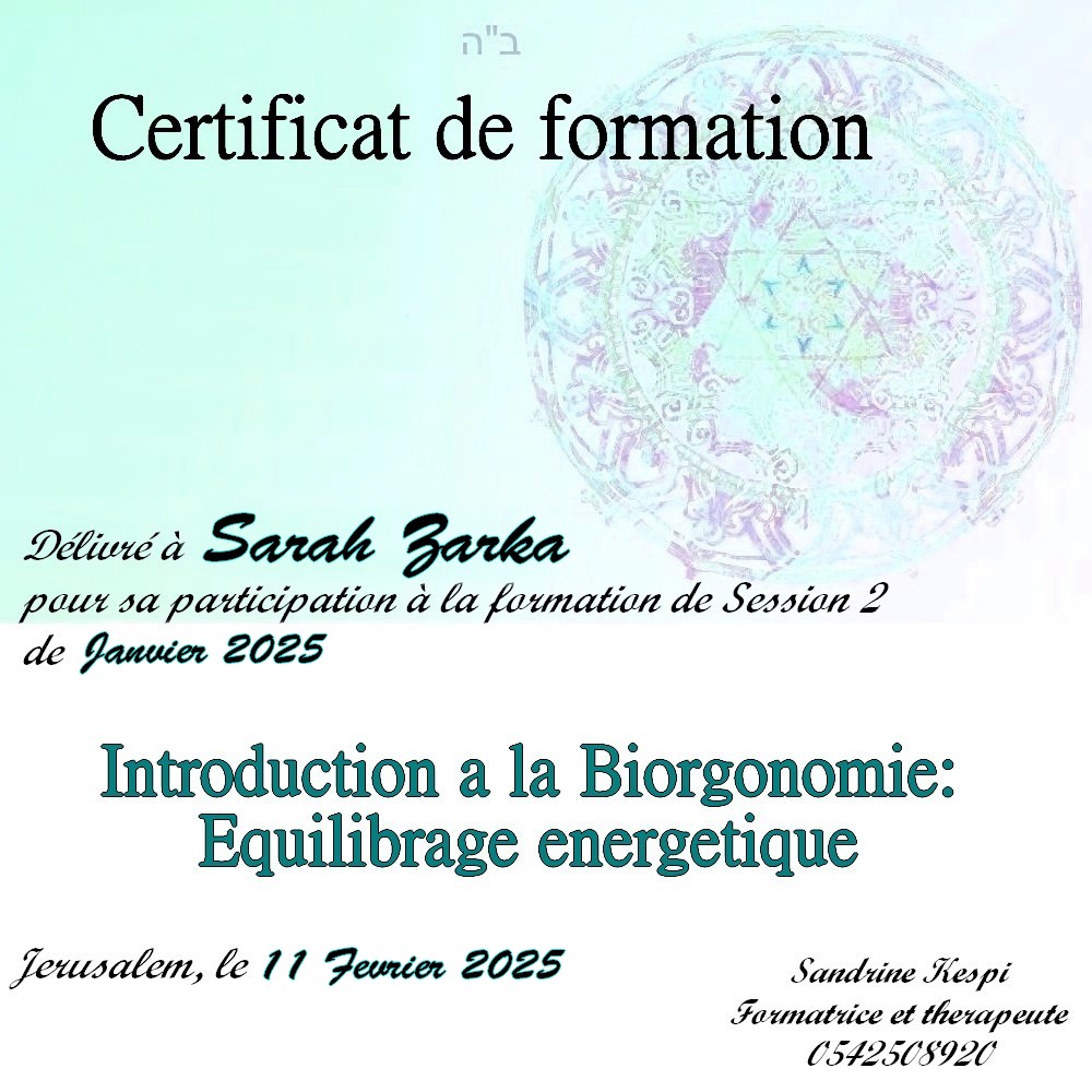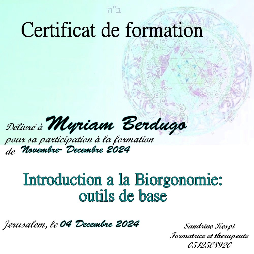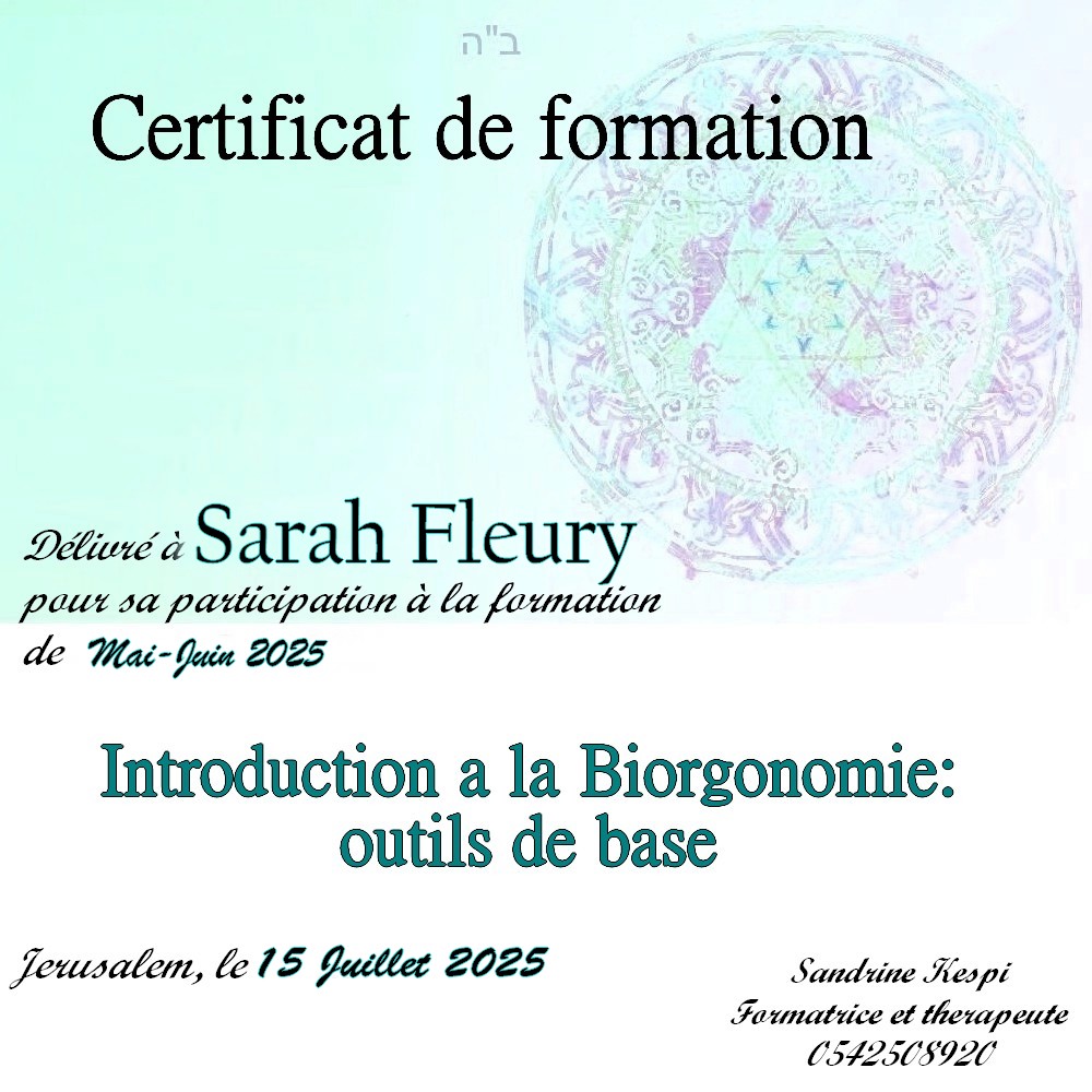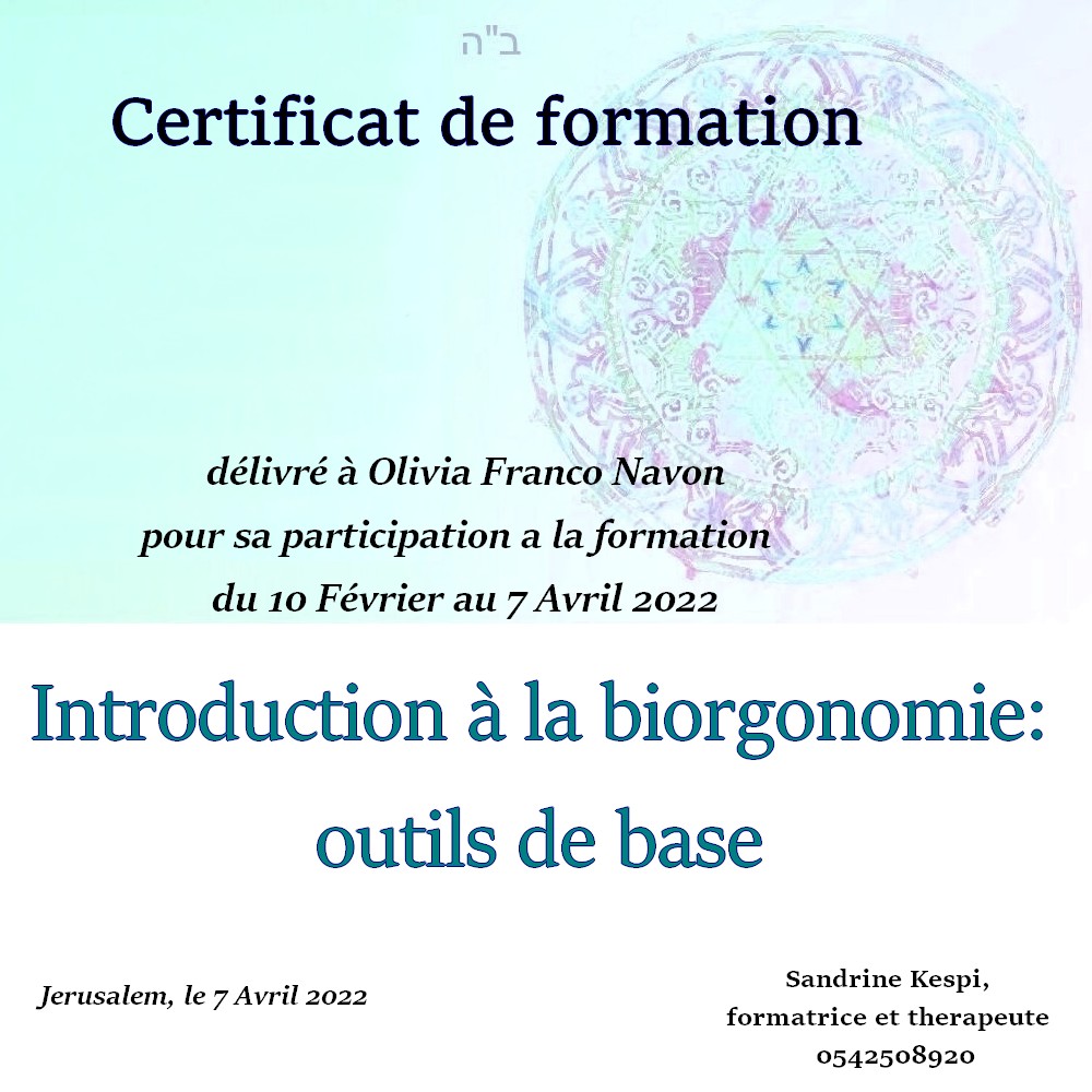 « Bonjour Sandrine. Contente de te voir en video aussi passionnée et radieuse. Des que je t’ai vu à qualita j’ai su que c’était ça que voulais faire. J’ai découvert en faisant la bioorgonomie session 1 un monde de connexion avec l’univers et avec Hachem. Un monde dont on sait qu’il existe mais on ne peut pas en parler sauf avec des initiés. Formation intensive riche dense et tu nous a donné les clefs pour une approche de soins différente. A bientôt 🥰 » Joelle S.