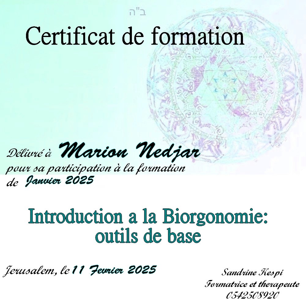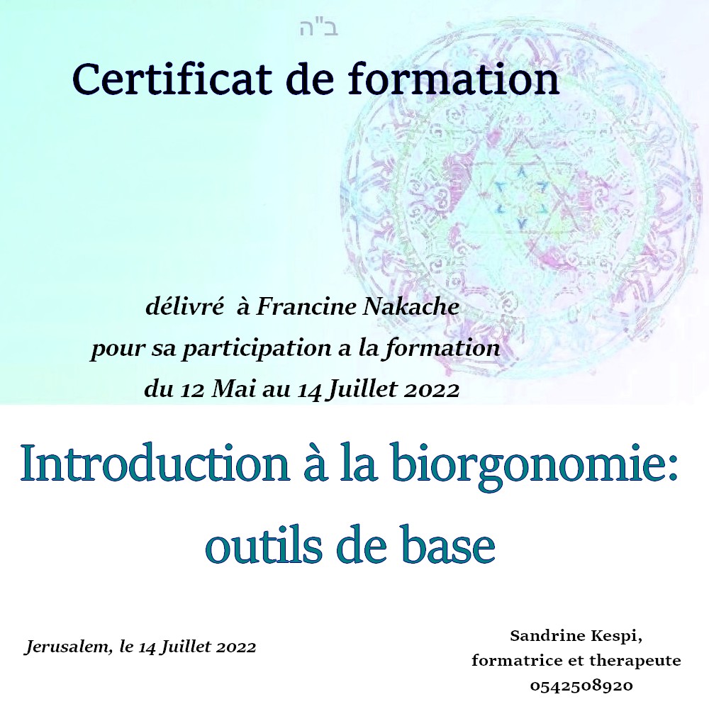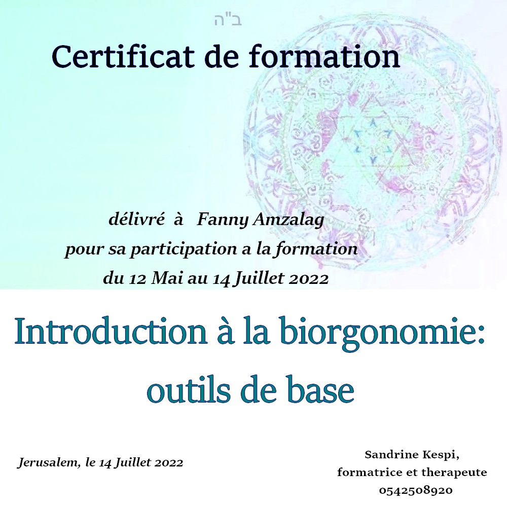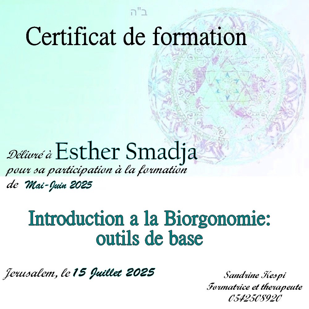 « Bonjour Sandrine. Contente de te voir en video aussi passionnée et radieuse. Des que je t’ai vu à qualita j’ai su que c’était ça que voulais faire. J’ai découvert en faisant la bioorgonomie session 1 un monde de connexion avec l’univers et avec Hachem. Un monde dont on sait qu’il existe mais on ne peut pas en parler sauf avec des initiés. Formation intensive riche dense et tu nous a donné les clefs pour une approche de soins différente. A bientôt 🥰 » Joelle S.