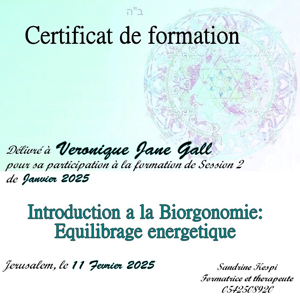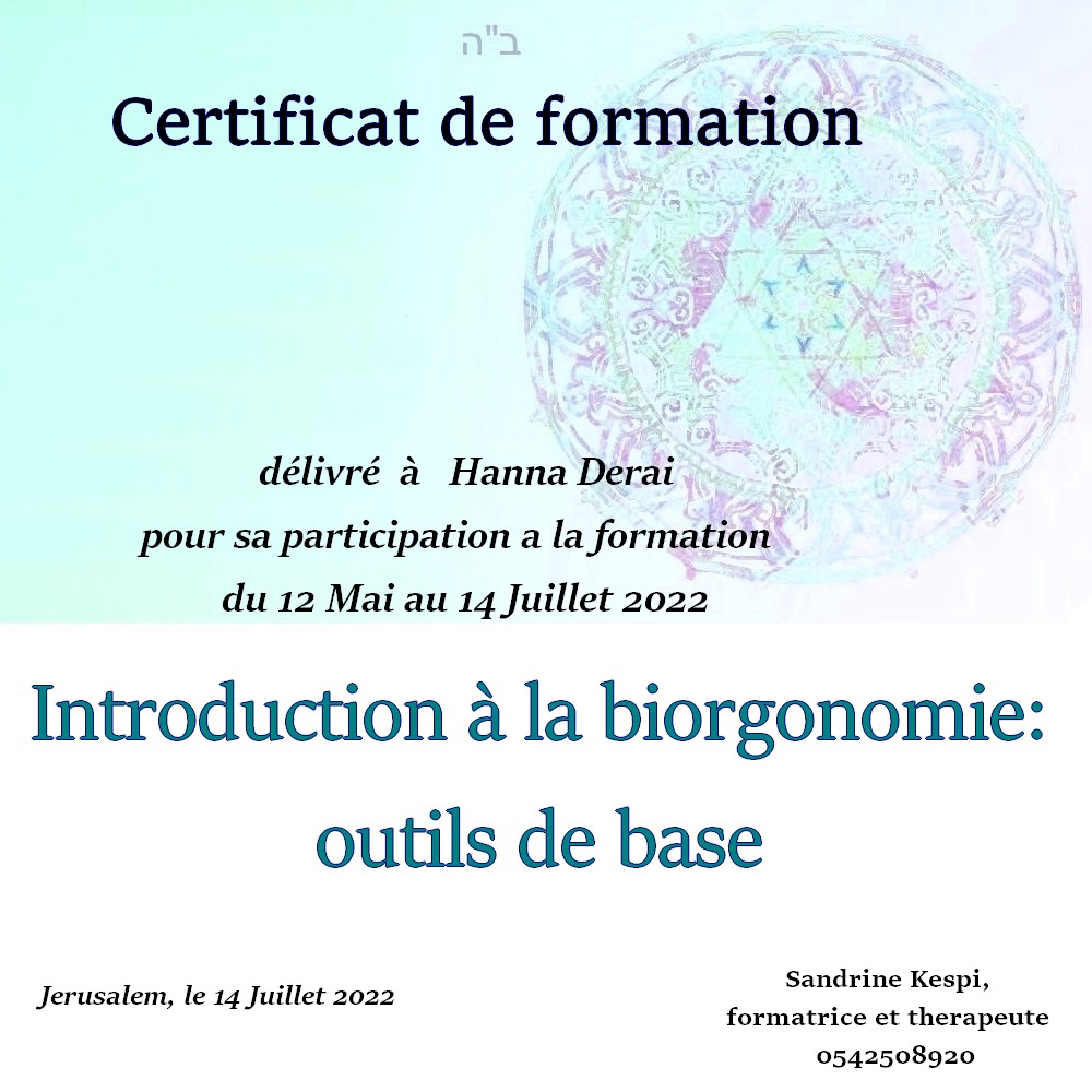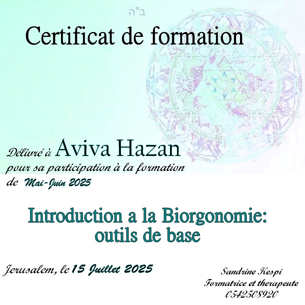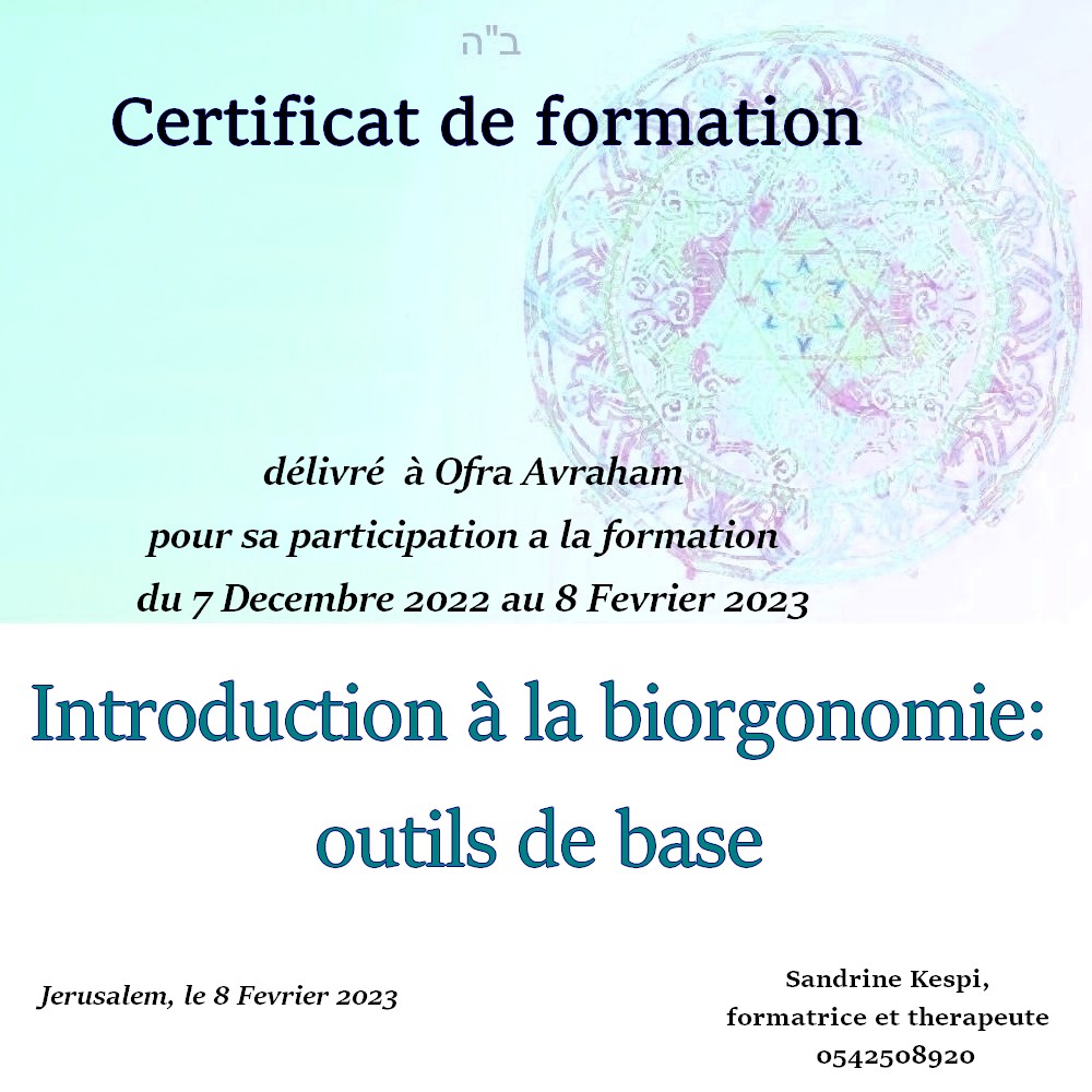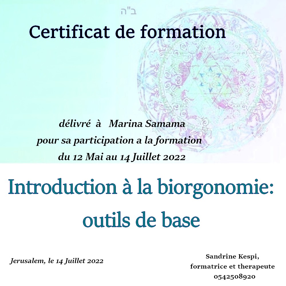 « Bonjour Sandrine. Contente de te voir en video aussi passionnée et radieuse. Des que je t’ai vu à qualita j’ai su que c’était ça que voulais faire. J’ai découvert en faisant la bioorgonomie session 1 un monde de connexion avec l’univers et avec Hachem. Un monde dont on sait qu’il existe mais on ne peut pas en parler sauf avec des initiés. Formation intensive riche dense et tu nous a donné les clefs pour une approche de soins différente. A bientôt 🥰 » Joelle S.