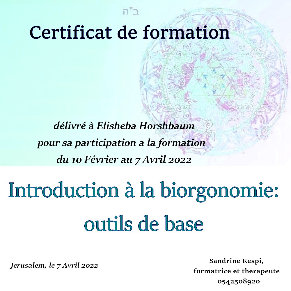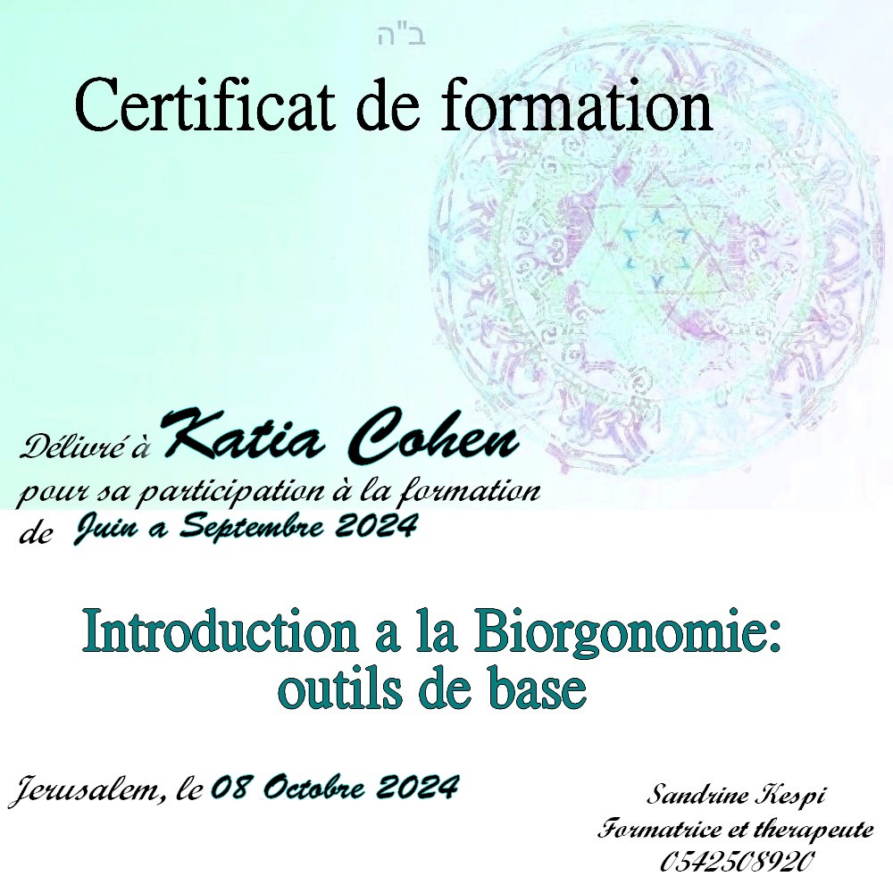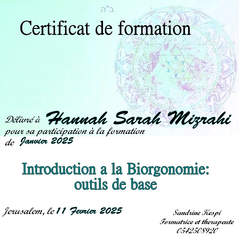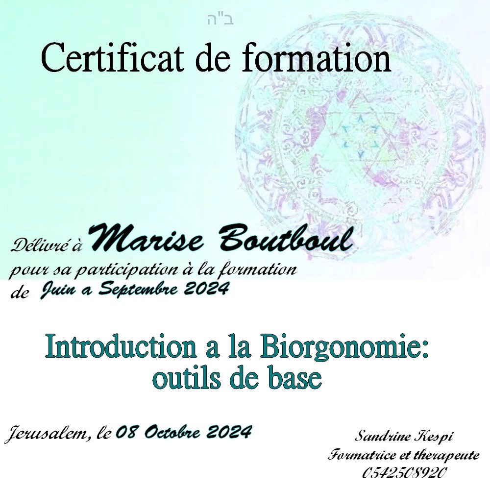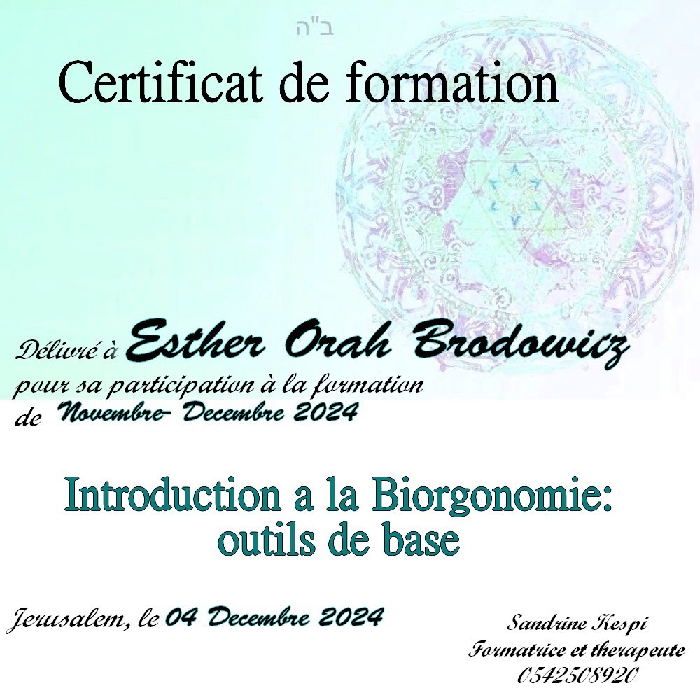 « Bonjour Sandrine. Contente de te voir en video aussi passionnée et radieuse. Des que je t’ai vu à qualita j’ai su que c’était ça que voulais faire. J’ai découvert en faisant la bioorgonomie session 1 un monde de connexion avec l’univers et avec Hachem. Un monde dont on sait qu’il existe mais on ne peut pas en parler sauf avec des initiés. Formation intensive riche dense et tu nous a donné les clefs pour une approche de soins différente. A bientôt 🥰 » Joelle S.