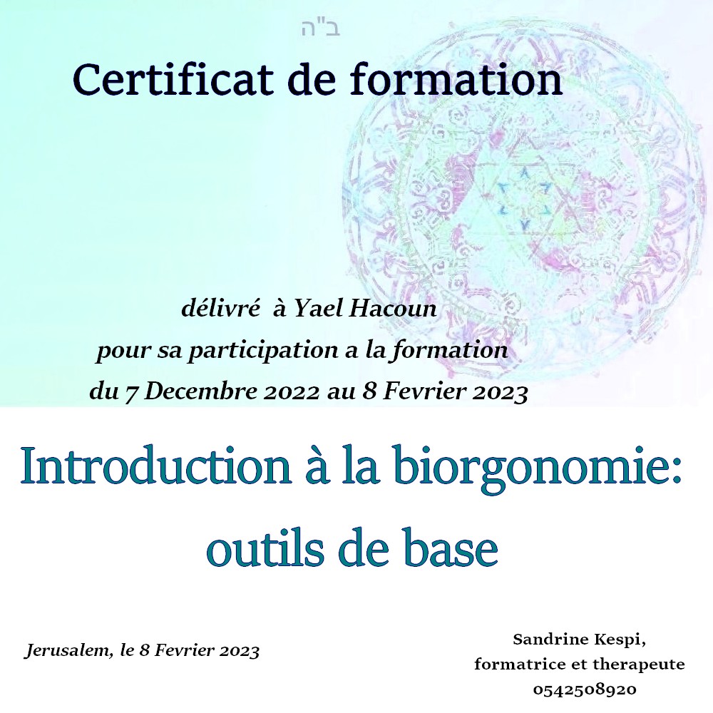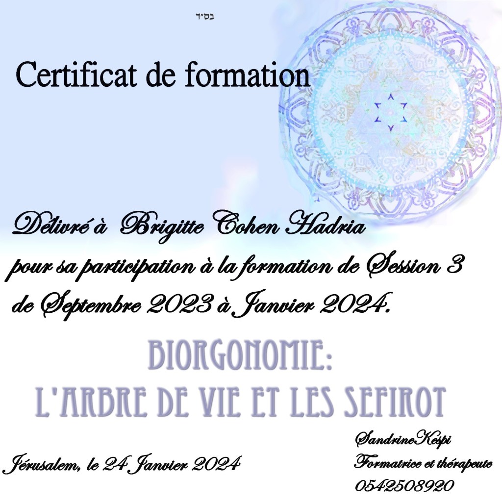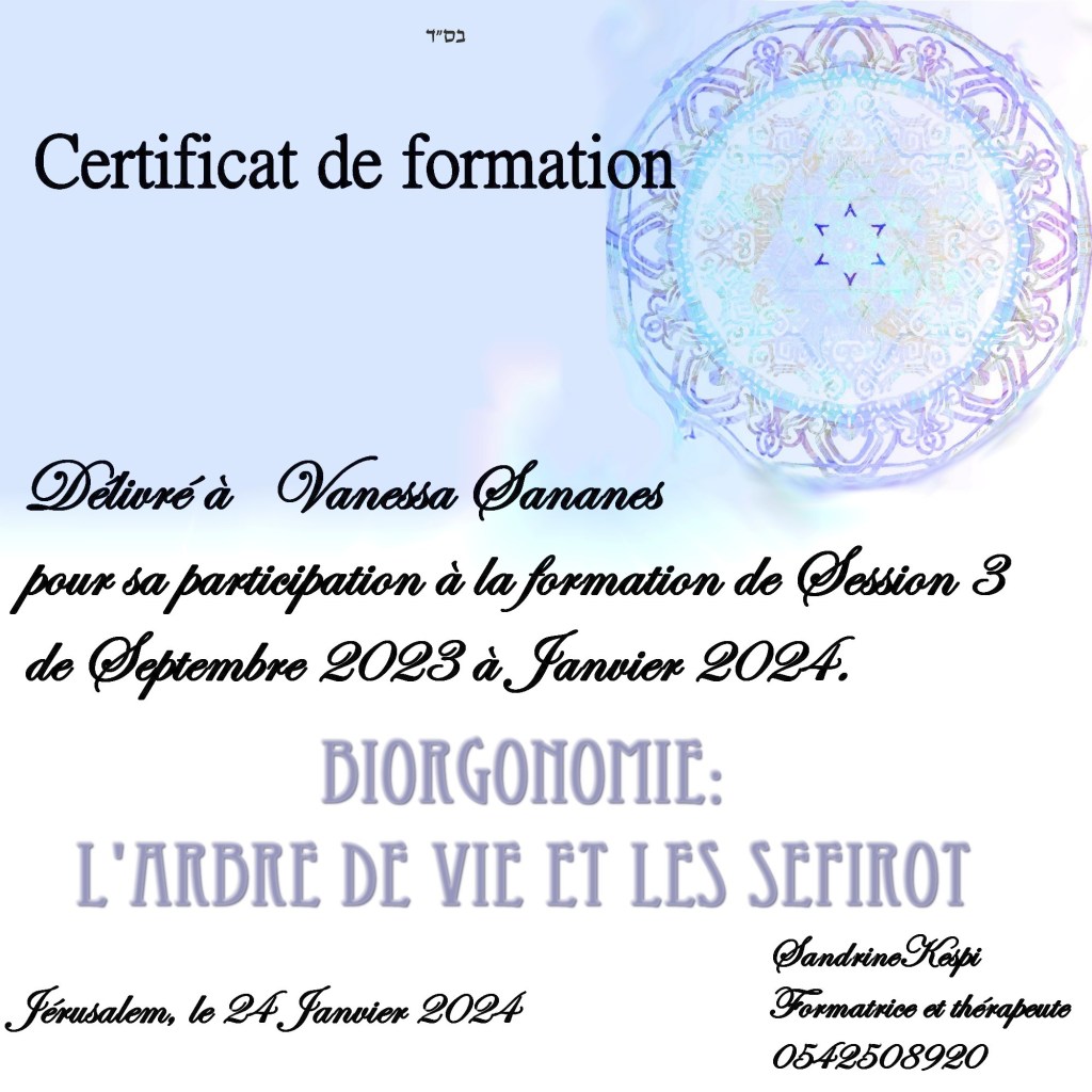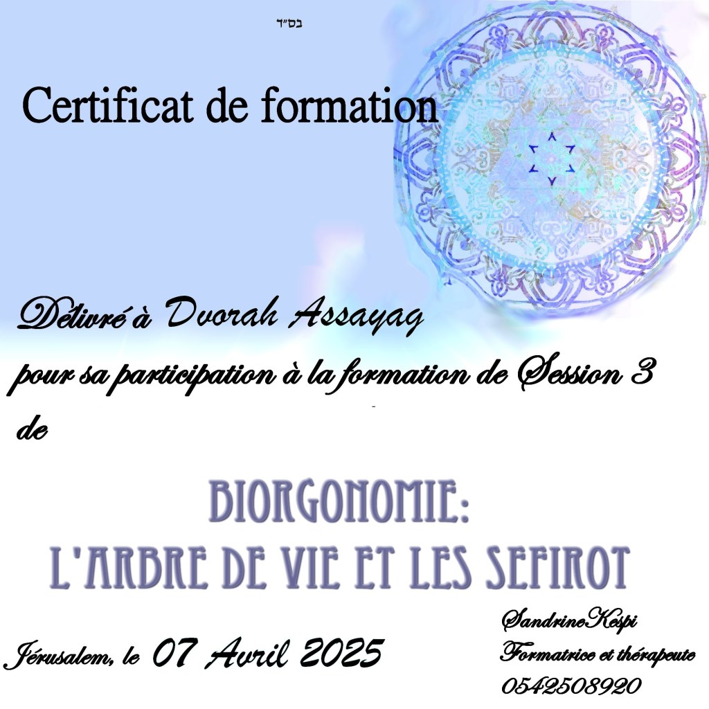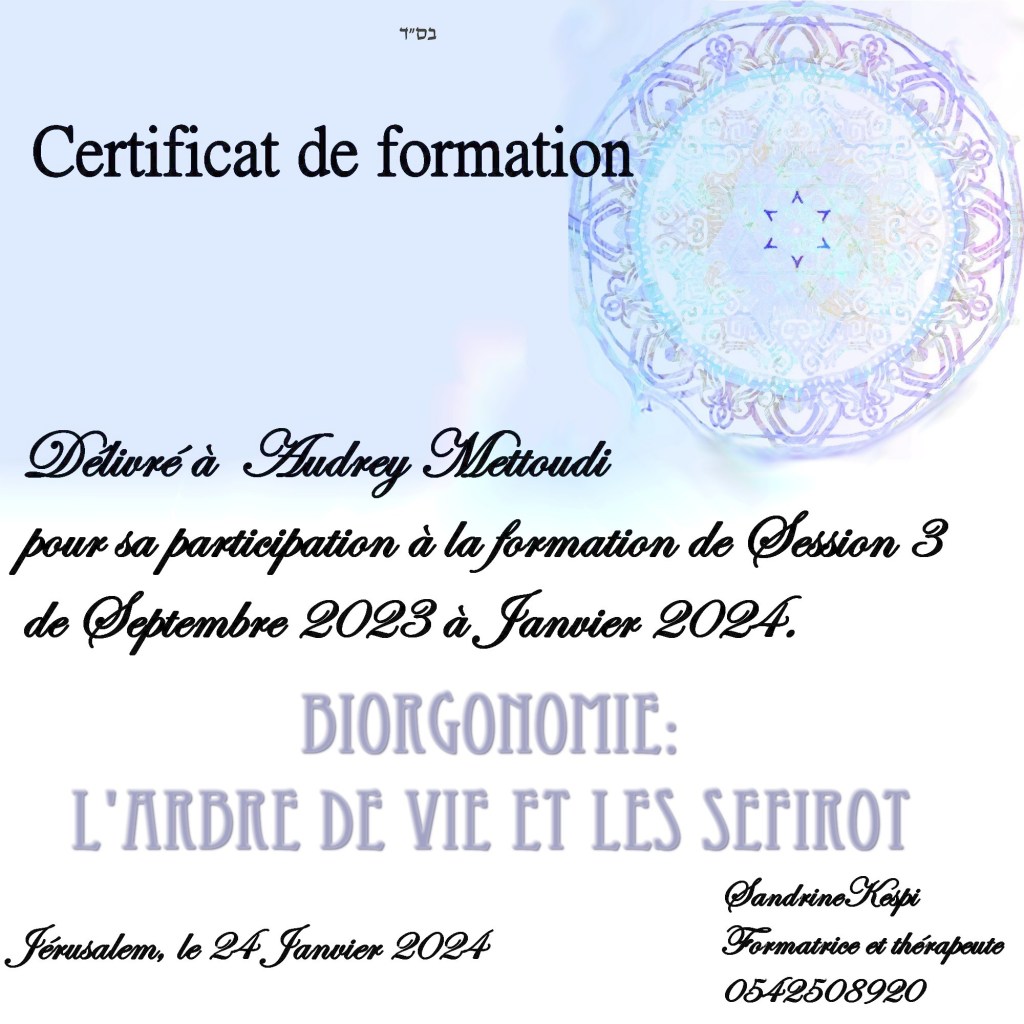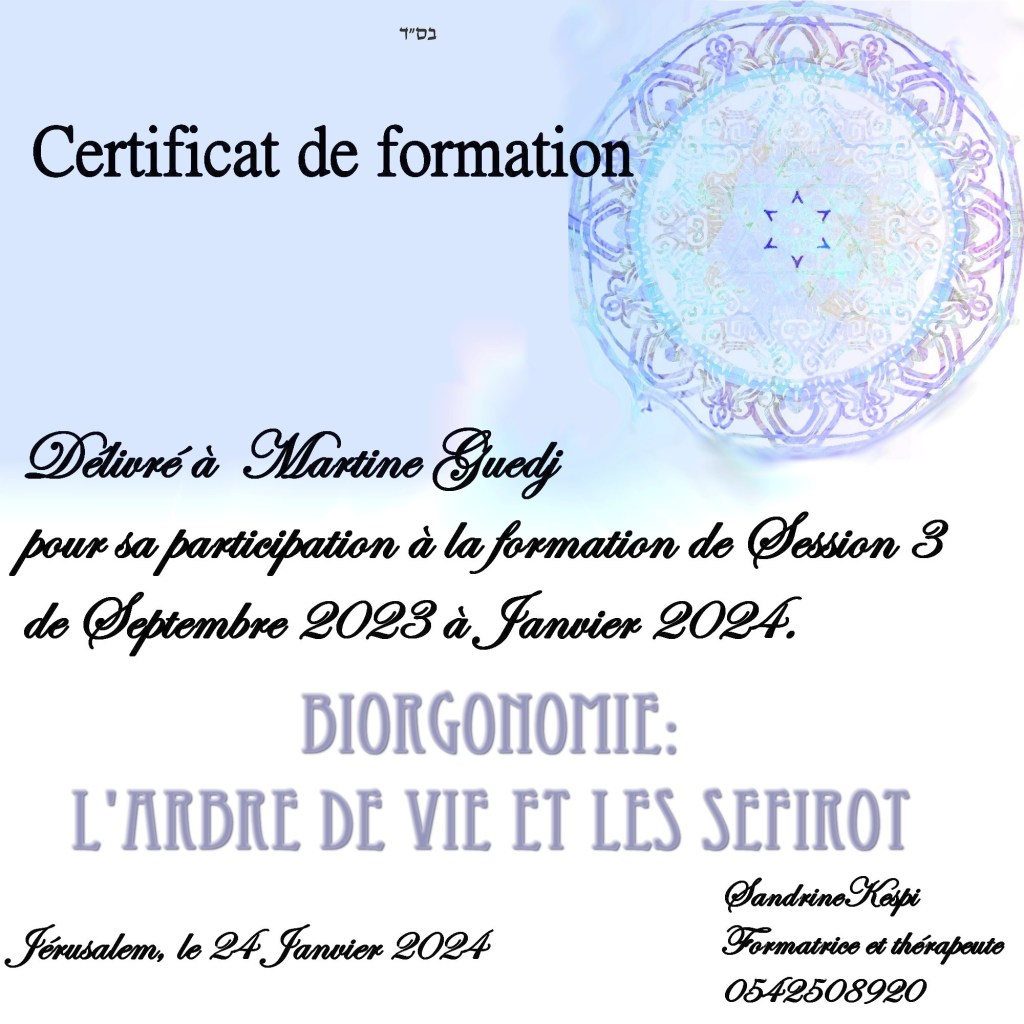 La troisieme session n est ouverte qu’aux hebraisants puisqu elle repose sur la comprehension et l ‘utilisation de l’arbre de vie et plus particulierement des Sefirot. C est un versant plus existentiel qui ramene chacun a son fil de vie, ses origines et ses buts. Cette formation comprend 15 cours en presentiel ou en zoom enregistre.